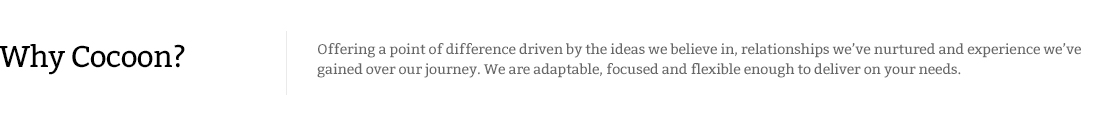 With Cocoon you can quickly and efficiently assess the feasibility of an idea. We tailor solutions with no upfront design fees to the point of concept and indicative pricing for any potential clients or existing customers wishing to source or develop a new item or line of products. We are mindful of commercial realities and have a history of delivering unique solutions on time and budget.