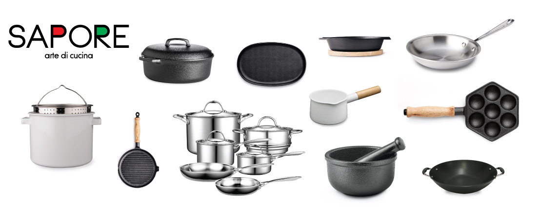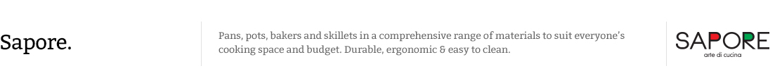 Pans, pots, bakers and skillets in a comprehensive range of materials to suit everyone’s cooking space and budget. Durable, ergonomic, easy to clean ranges of enameled, cast iron, stainless and copper based items. Whether you’re an avid home cook or occasional kitchen dabbler, SAPORE brings commercial kitchen quality and design to your home.